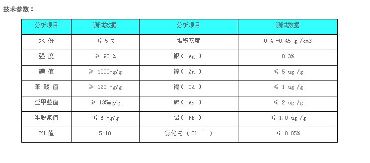 一般在水處理中使用的活性炭,其表面積不一定過大,但是應(yīng)具有較多的過渡孔隙及較大的平均孔徑。日本市埸售一些液相用的活性炭具有以下特性:比表面積為850--1000m2/g,孔隙容積為0.88--1.5ml/g,平均孔隙半徑為40到50A。